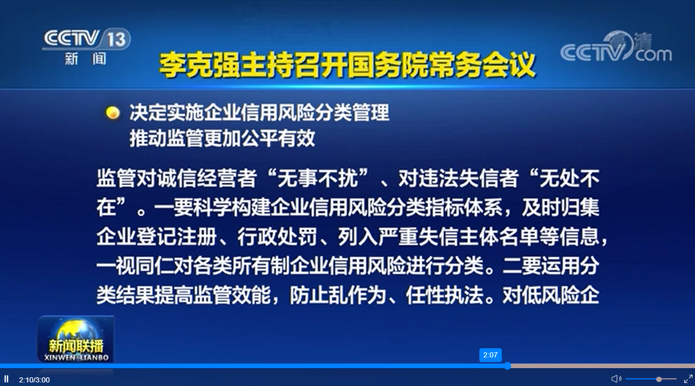 會議指出,信用是市場經(jīng)濟的基礎(chǔ)。為營造誠實守信、公平競爭市場環(huán)境,要依法依規(guī)推進企業(yè)信用風險分類管理,相應(yīng)采取“雙隨機、一公開”等科學精準的監(jiān)管措施,使監(jiān)管對誠信經(jīng)營者“無事不擾”、對違法失信者“無處不在”。