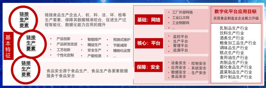 數(shù)字化食品生產(chǎn)企業(yè)界定:基于“互聯(lián)網(wǎng)+”發(fā)展概念,以云計算服務(wù)、大數(shù)據(jù)計算、5G通訊技術(shù)、區(qū)塊鏈應(yīng)用技術(shù)為代表的先進信息技術(shù)與食品生產(chǎn)業(yè)務(wù)深度融合形成的新業(yè)務(wù)平臺和新運營模式,本質(zhì)是用“數(shù)據(jù)+模型”的方式方法為食品生產(chǎn)企業(yè)提供輔助業(yè)務(wù)實操的應(yīng)用服務(wù),以管理中心、生產(chǎn)制造中心、質(zhì)控保障中心、經(jīng)營銷售中心、食品安全中心的數(shù)據(jù)互聯(lián)互通為基礎(chǔ),通過對人機料法環(huán)檢六維數(shù)據(jù)的全面量化建模、快速計算處理和實時傳輸交換,實現(xiàn)數(shù)據(jù)控制、生產(chǎn)優(yōu)化和生產(chǎn)組織方式變革的先進數(shù)字制造型企業(yè)。